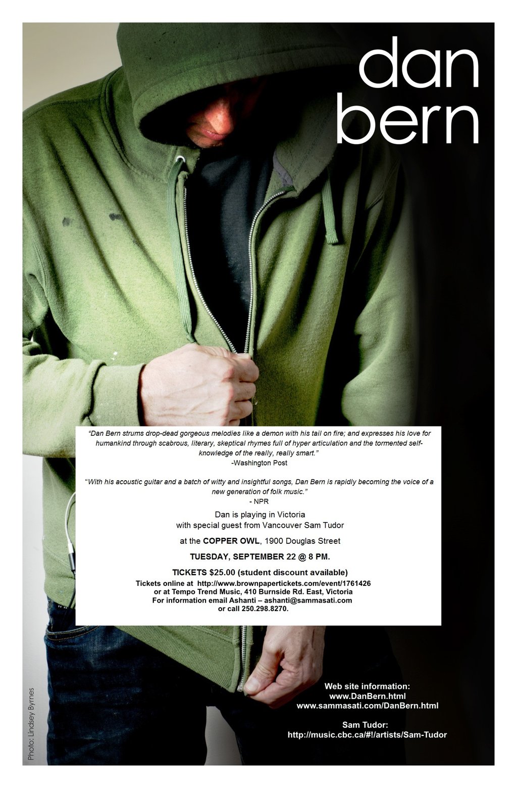 September 22, 2015 Dan will be back for another show in Victoria (with special guest Sam Tudor) at the Copper Owl on Douglas Street. Tickets are $25. (student discount available) through Brown Paper Tickets. More info available at http://www.sammasati.com/DanBern.html Check out Dan at http://concertedefforts.com/roster/dan-bern or www.DanBern.com